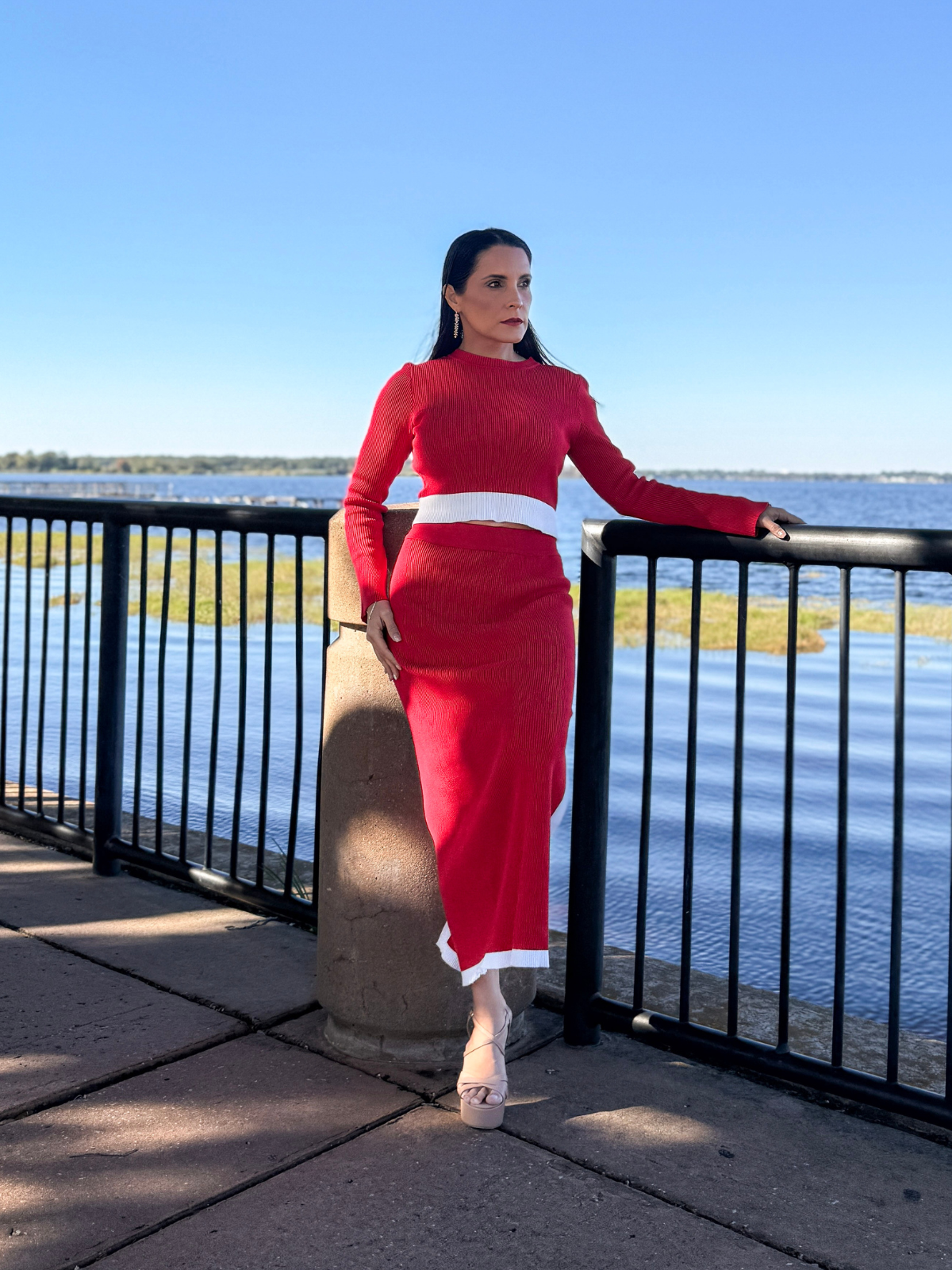 Su tono rojo intenso, combinado con delicados acentos blancos, crea una silueta refinada y femenina. El top de manga larga abraza el cuerpo con elegancia, mientras la falda midi con abertura trasera añade un toque de sensualidad sofisticada. La textura ligera, suave y estructurada del tejido ofrece comodidad y un fit impecable que realza tus curvas con clase.
