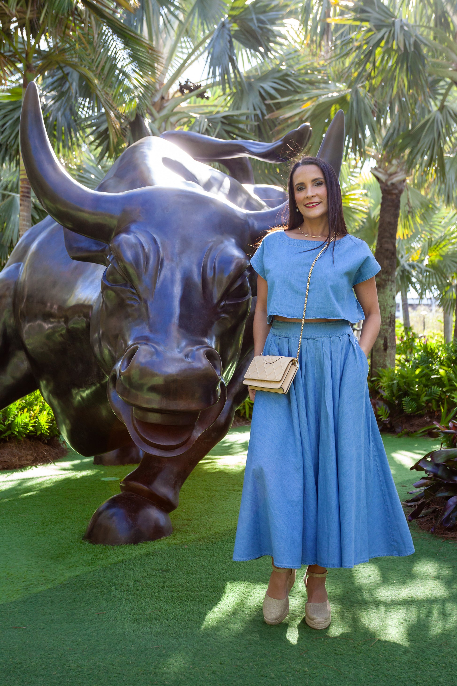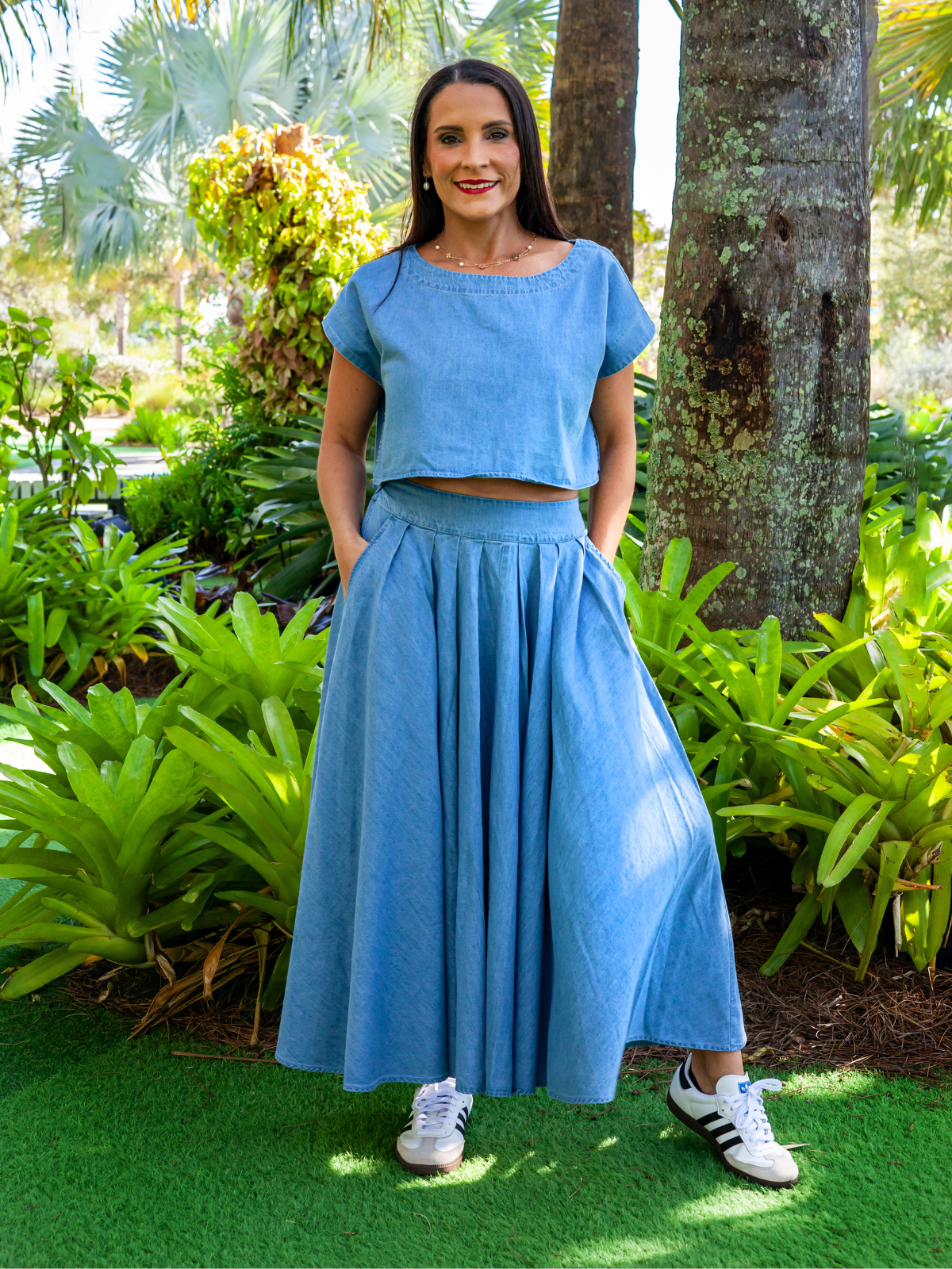 El top tiene un corte relajado tipo crop que brinda un aire juvenil pero chic, mientras que la falda midi amplia cae con fluidez para crear una silueta favorecedora, elegante y con ese toque único que amamos.