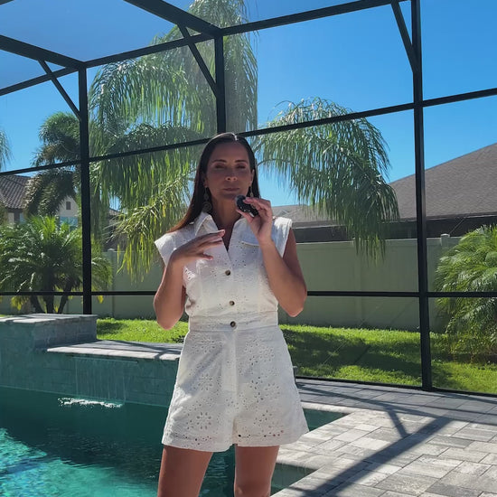 El Encanto Blanco Romper combina elegancia y frescura en una sola pieza. Diseñado en delicado eyelet fabric con corte tipo camisa y botones frontales, ofrece un look pulido pero cómodo para cualquier ocasión. Su cuello en “V” alarga la figura, mientras que la cintura definida y los bolsillos laterales aportan el balance perfecto entre estilo y funcionalidad.