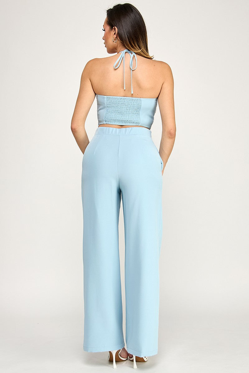 El top halter con encaje aporta un aire romántico y sofisticado, resaltando la parte superior con una silueta femenina y refinada. Su diseño con detalle en el cuello y ajuste en la espalda crea un acabado delicado que se siente tan especial como se ve.