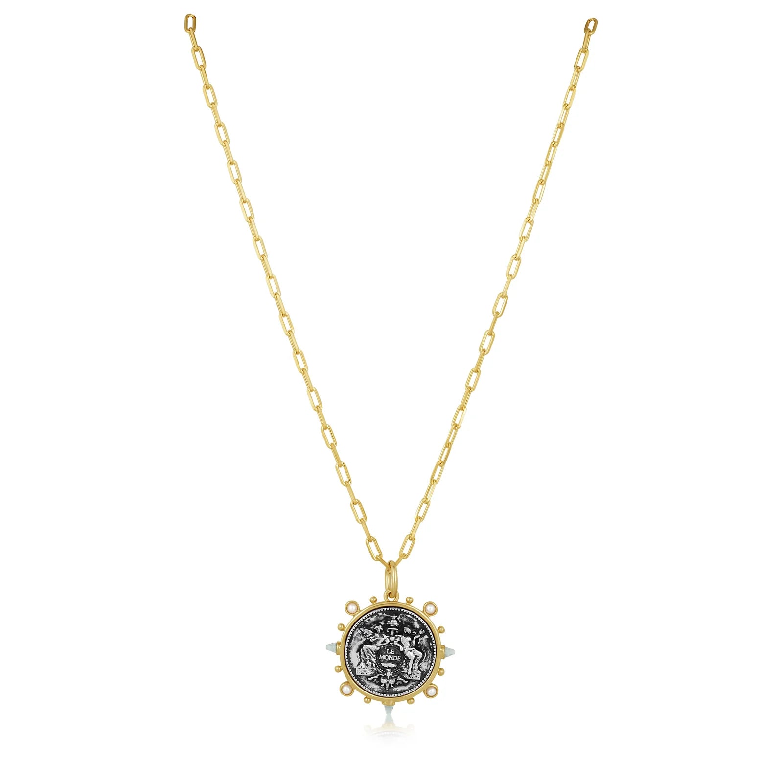Conquista el mundo con elegancia con el Le Monde Doré Necklace. Este collar combina un diseño clásico con un toque audaz: un colgante inspirado en una moneda antigua, enmarcado con detalles brillantes que representan fuerza, aventura y poder femenino.