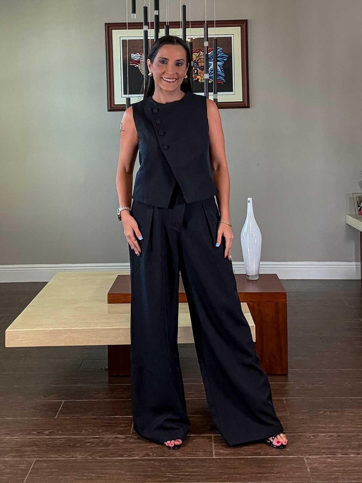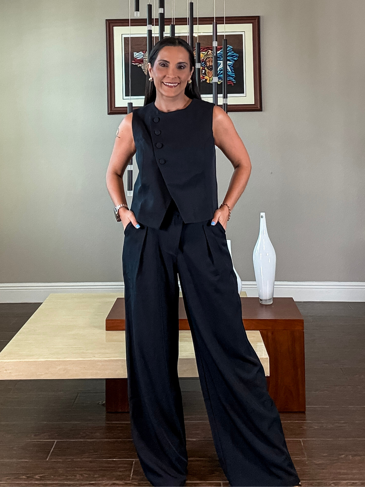 El Medianoche Serena Set es la definición de elegancia moderna. Con un top estructurado sin mangas y pantalón palazzo de caída fluida, este conjunto en tono navy estiliza la silueta y transmite seguridad sin esfuerzo. Su diseño limpio y minimalista lo convierte en una pieza clave para la mujer profesional que quiere verse pulida, poderosa y cómoda a la vez.