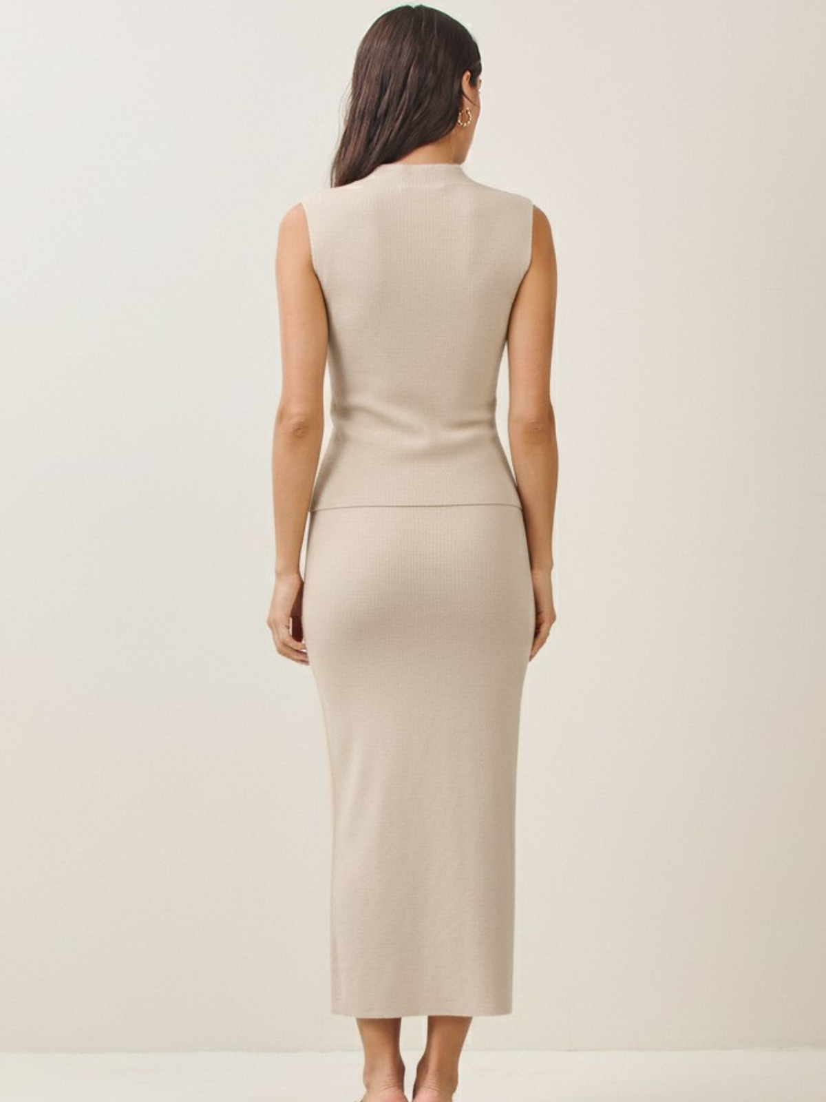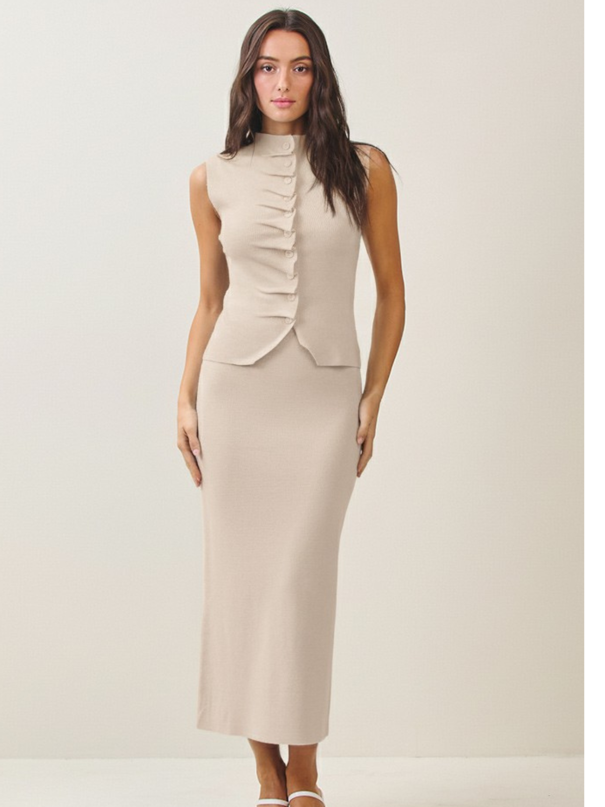 Nuestro best seller ahora disponible en color oatmeal. Un conjunto diseñado para destacar con clase y sofisticación. El Noches de Uva Set incluye un top sin mangas con pliegues frontales delicados y una falda a juego de largo midi que estiliza la silueta. Confeccionado en un tejido sweater knit de textura suave, combina comodidad con un look refinado ideal para la oficina, cenas elegantes o cualquier ocasión especial.