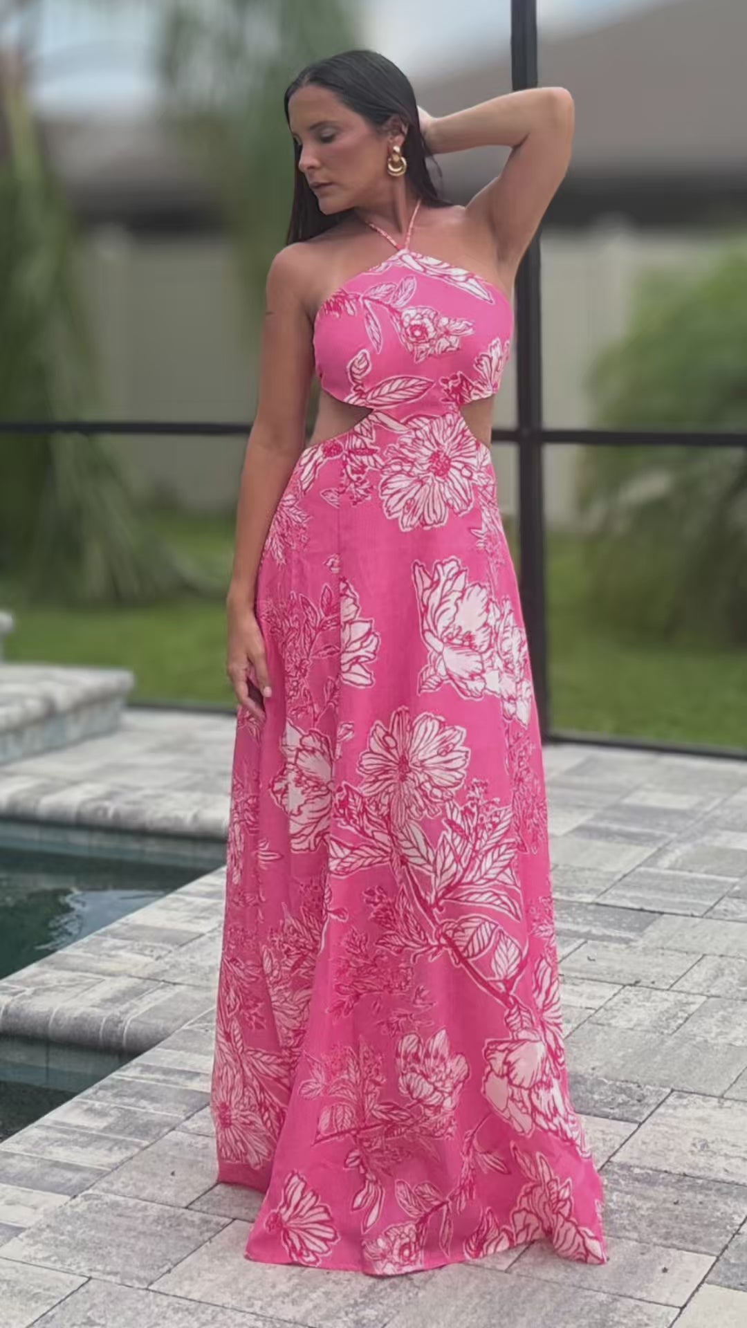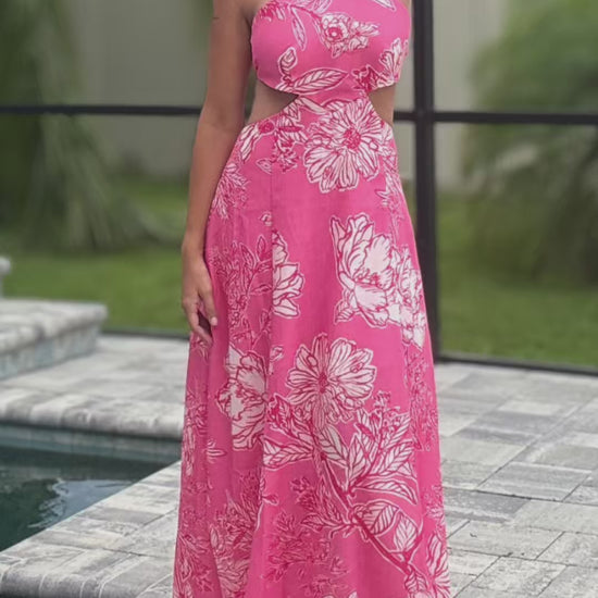 Meet your easy show-stopper. A vibrant maxi in bold pink floral with a flattering halter neckline, adjustable tie-back, and subtle side cutouts that celebrate your shape while staying comfy all day (and night).