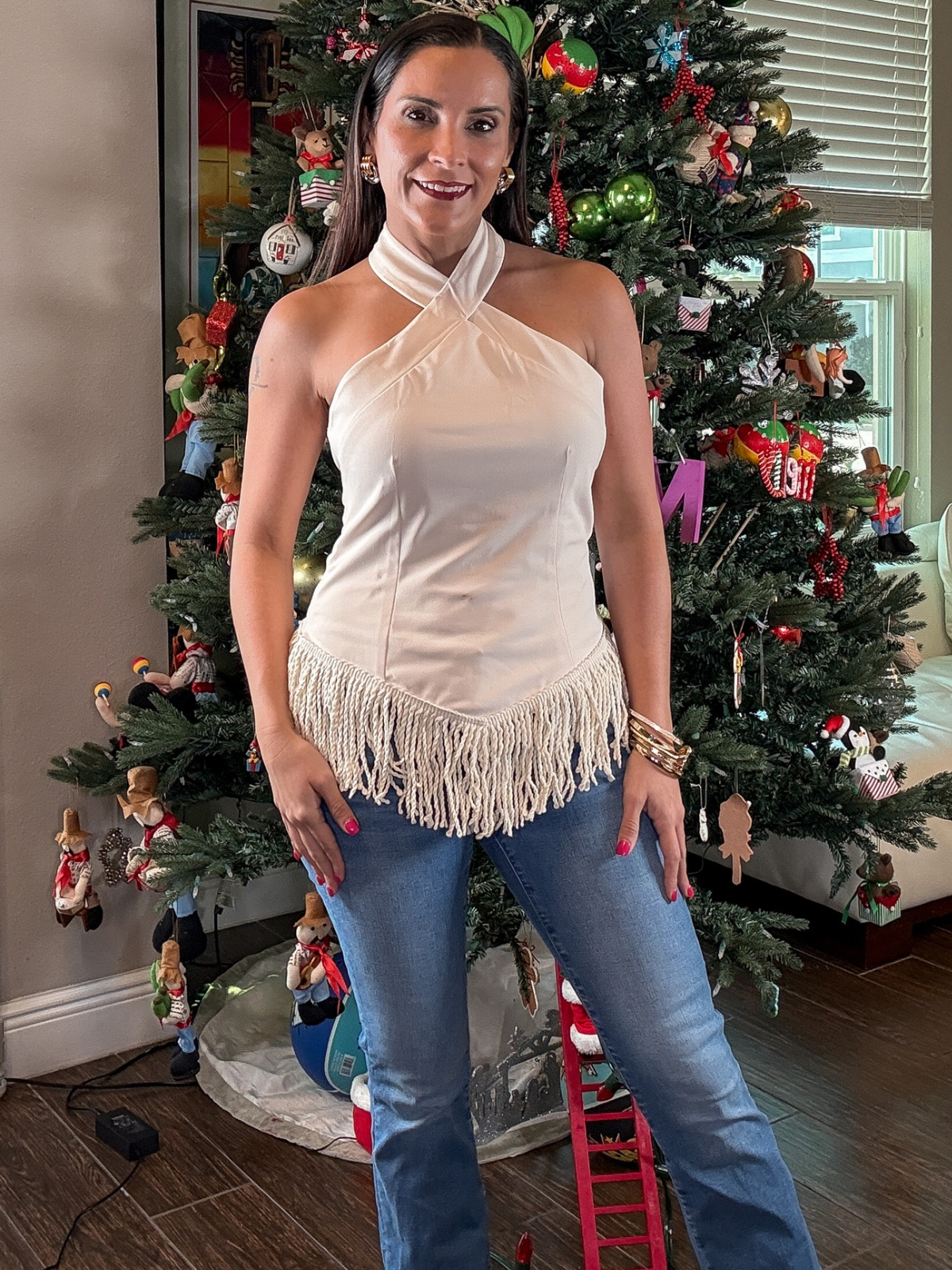 La protagonista del top es su fringe artesanal en tono crema, un detalle con movimiento que añade un toque boho-chic perfecto para darle vida a cualquier outfit. Hecho en un tejido suave y con buen stretch, se ajusta de forma favorecedora sin apretar, ideal para tus días ocupados.