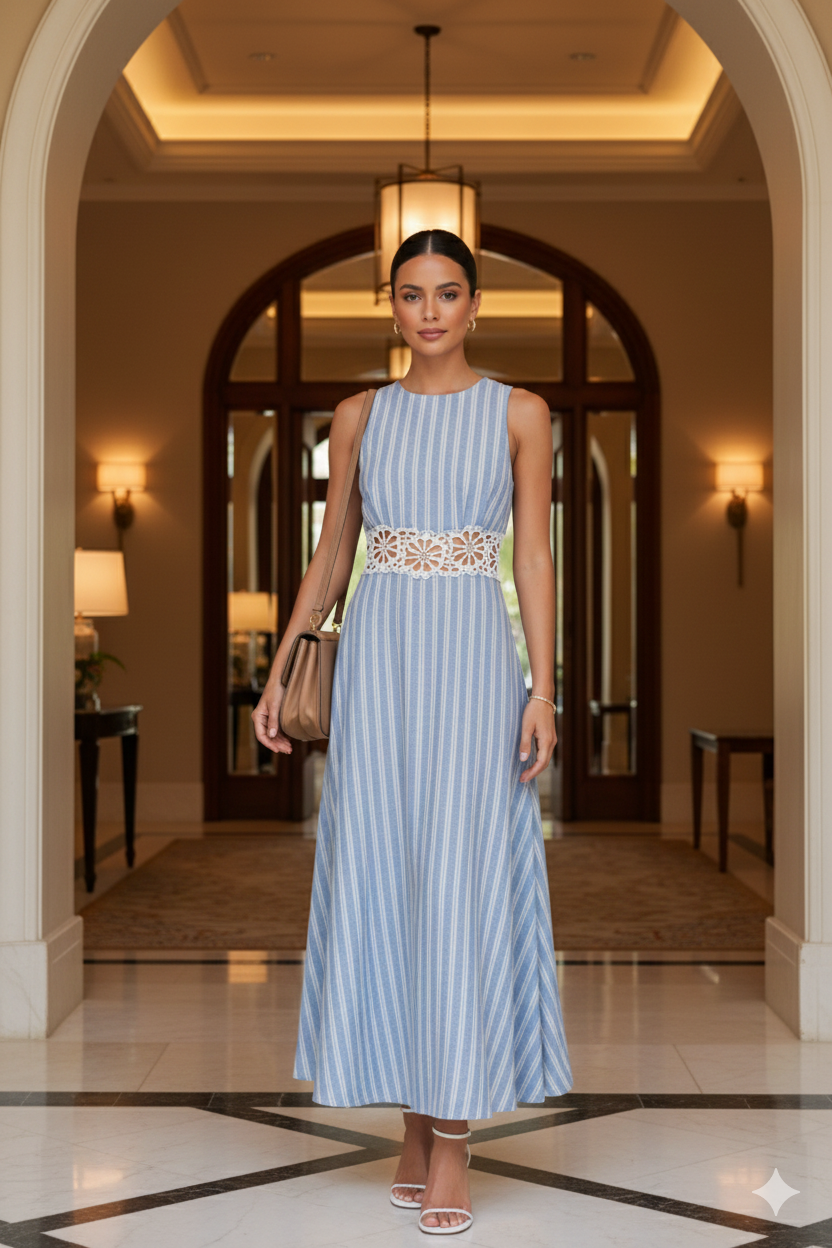 Vestido midi de rayas verticales confeccionado en una mezcla de algodón y poliéster que ofrece estructura y comodidad. Su diseño destaca por el delicado encaje en la espalda con detalle abierto, aportando un toque femenino y sofisticado sin perder elegancia. La falda de caída fluida crea un movimiento natural al caminar, ideal para ocasiones especiales de día o eventos donde buscas un look pulido y diferente.