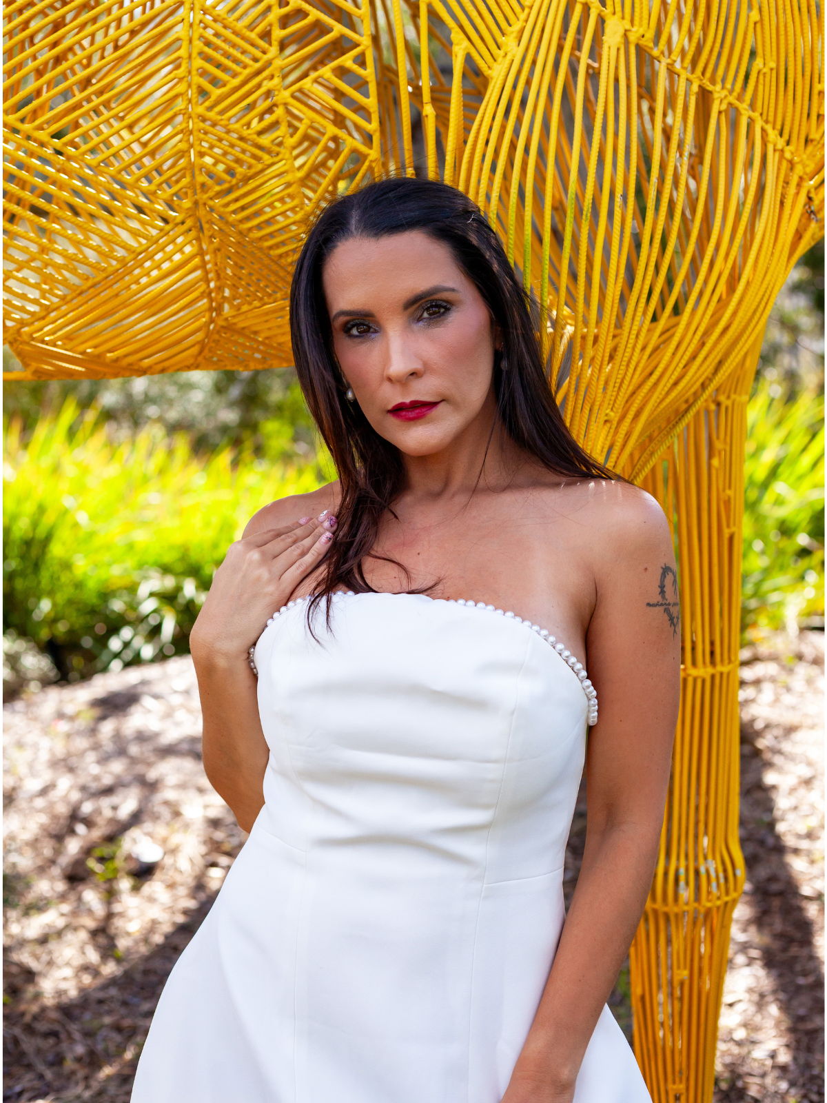 Su detalle de perlas en el borde superior añade un acabado refinado y delicado, mientras el corte strapless realza los hombros y alarga la silueta con elegancia.